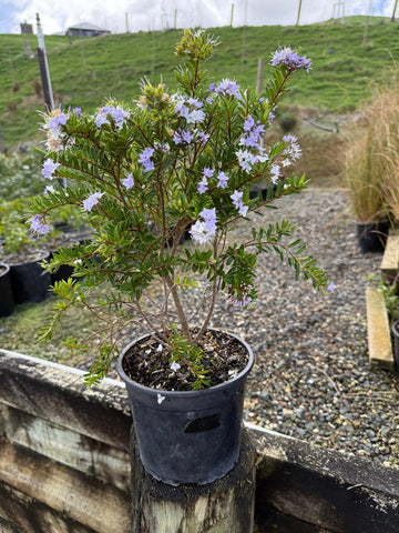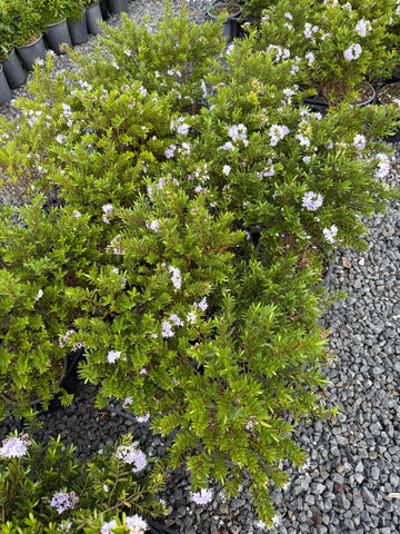A compact, evergreen native shrub with small, narrow, glossy green leaves. In spring through summer it produces soft mauve to lilac flowers, held in delicate clusters that attract bees and butterflies. Its neat, bushy form makes it ideal for both ornamental planting and low-maintenance landscapes.